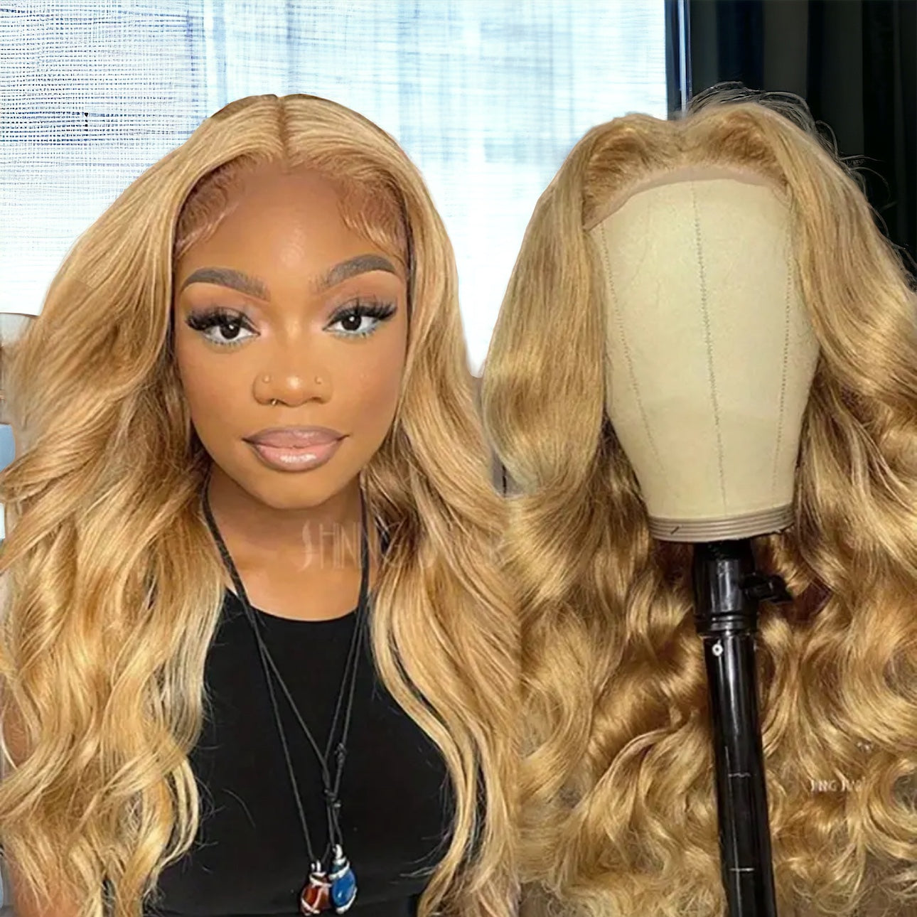 Get ready to slay with our golden 13x4 HD Lace Front Wig! Made with high-quality human hair. This pre-plucked wig features baby hair and 150% density ensuring a full and voluminous look, while the lace front allows for versatile styling options.